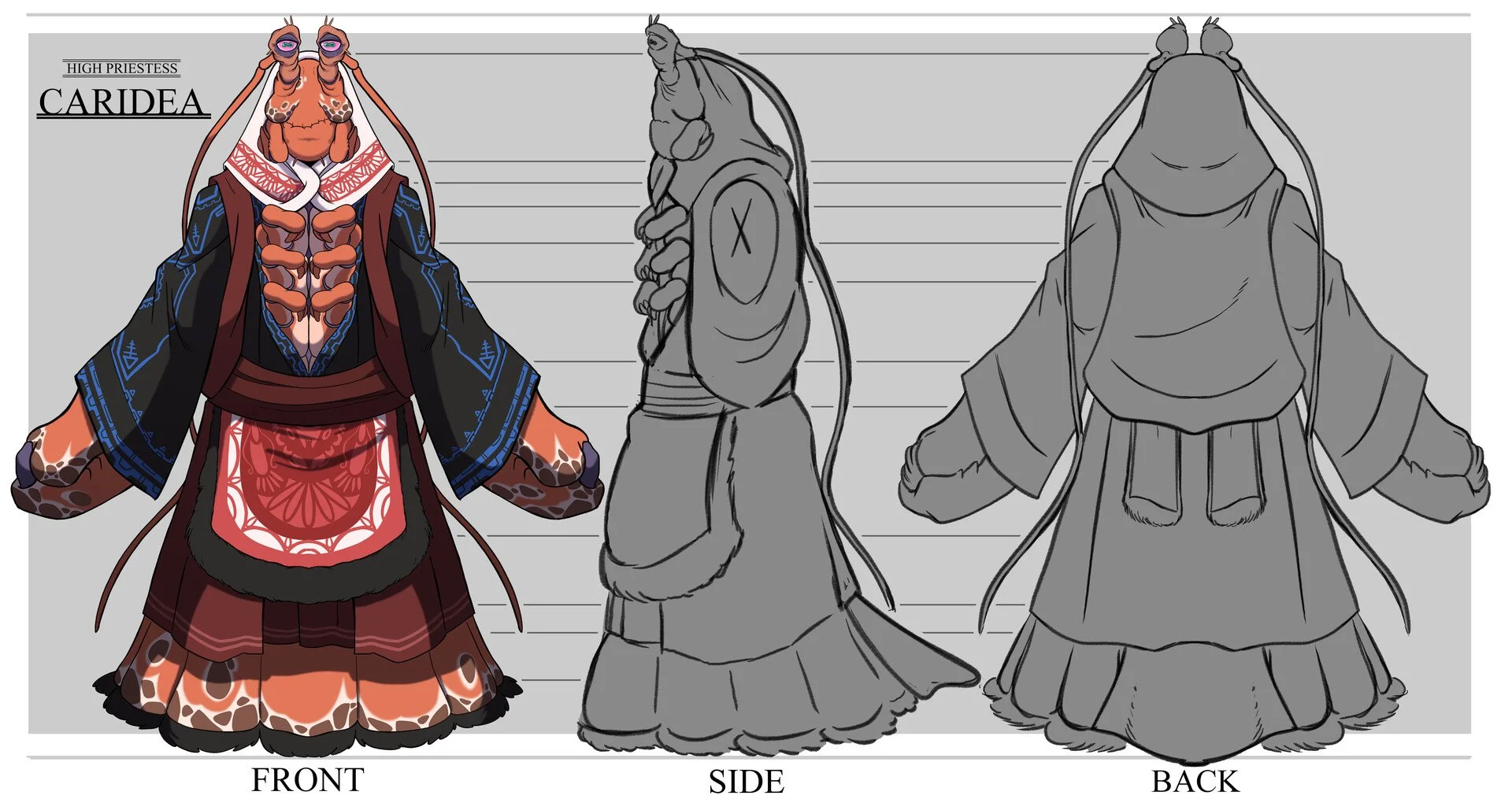 Caridea’s design is inspired by the mantis shrimp, with her older, shaman-like appearance emerging naturally from the silhouette of a bipedal version of the creature. The hunched, enclosed posture suggested wisdom and age, which guided the rest of the concept. Her clothing draws influence from Serbian folk attire, grounding her in a distinct cultural style.